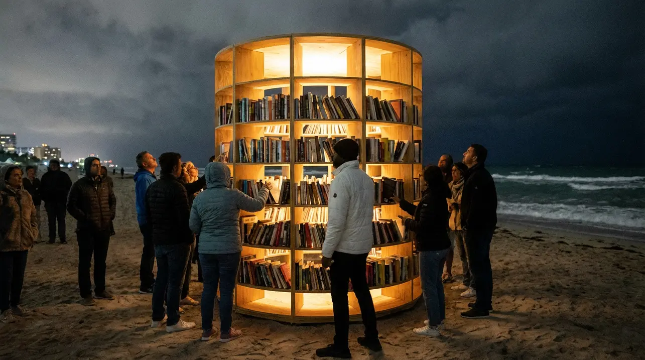 On the sands of Miami Beach, a new kind of stage has been set. For Miami Art Week, acclaimed artist and stage designer Es Devlin unveils a luminous, 20-foot-tall cylindrical library that rotates slowly by the sea.More than a sculpture, this temporary installation is a profound meditation on cultural memory, collective experience, and the fragile power of shared stories. Devlin, renowned for crafting immersive worlds for pop icons and global ceremonies, applies her mastery of scale to create a public space for awe and introspection.Illuminated from within, the revolving structure presents its curated collection of books as a chorus of voices and histories in perpetual motion. Its placement at the dynamic border of land and ocean serves as a poignant, unspoken statement on climate vulnerability, positioning the library as both a defiant archive and a potential ark for our collective consciousness.The work’s kinetic nature performs the very act of curation—asking which narratives are centered and which await their turn in the light, much like a director focusing a scene. In the heart of a bustling art fair environment, the installation offers a sanctuary for quiet contemplation, subtly challenging the week’s commercial frenzy by honoring the slow, tangible value of physical books.It invites visitors to become participants, encouraging them to take a volume and thus alter the work itself. This interactive gesture transforms the public from spectators into collaborators, breaking the fourth wall of traditional art viewing.Connecting to a lineage of artists who use books as medium, Devlin’s library stands as a beacon of participatory spectacle. As it turns against the twilight, it creates a unifying, theatrical moment—a lasting memory of shared humanity amidst the ephemeral tide of Art Week.